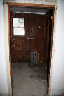 On the inside, there's been some more demo to the stairs in preparation for re-framing, the kitchen floor is missing, and the bathroom's been gutted. There's been some demo work done on the upstairs as well, but I wasn't able to get up there, due to the lack of stairs.