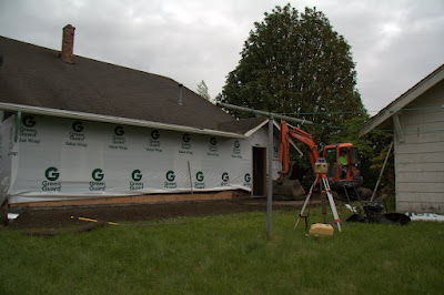 We went by the house this afternoon to find excavation work underway. On the front, they are preparing the space where the new, full-width porch will be. Out back, the house is growing a bit, and new foundation is being put in place for the extension.